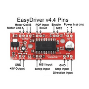 El Easy Driver es un simple controlador para motores de paso , es compatible con cualquier dispositivo que puede mandar un pulso de 0 a 5v. El easy driver puede manejar un motor de paso de 7 a 30v, es muy fácil de usar con Arduino y es bastante confiable para programar motores de paso mientras no se sobre pase su capacidad de corriente. (esquema de referencia)